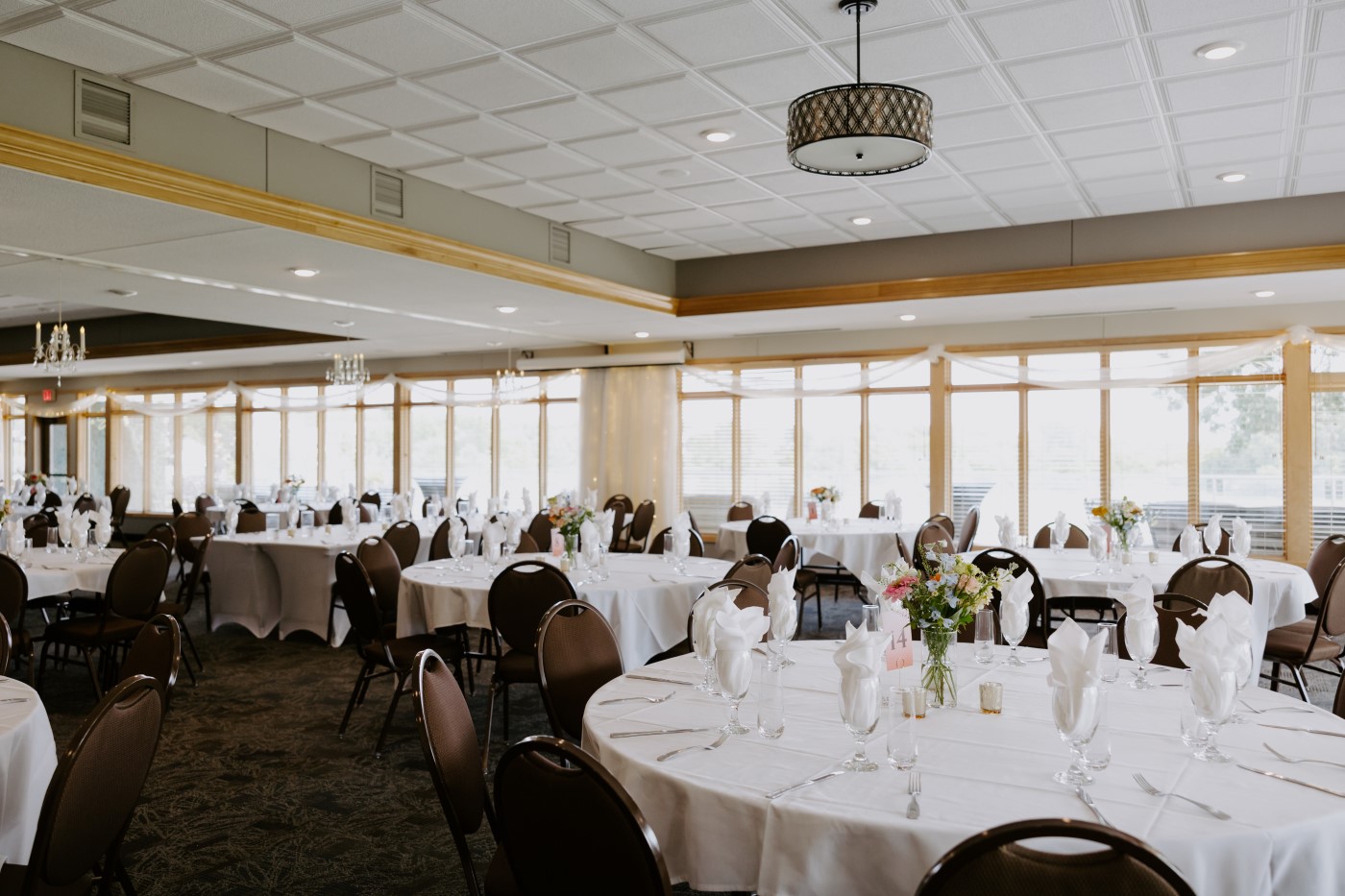 This private banquet room is an ideal venue for wedding receptions. With two walls of large and picturesque windows, the room offers beautiful views of the 16th & 18th greens, no matter what the season. Your guests can also enjoy the floral landscaped patio or cozy up by the fireplace in our spacious foyer.